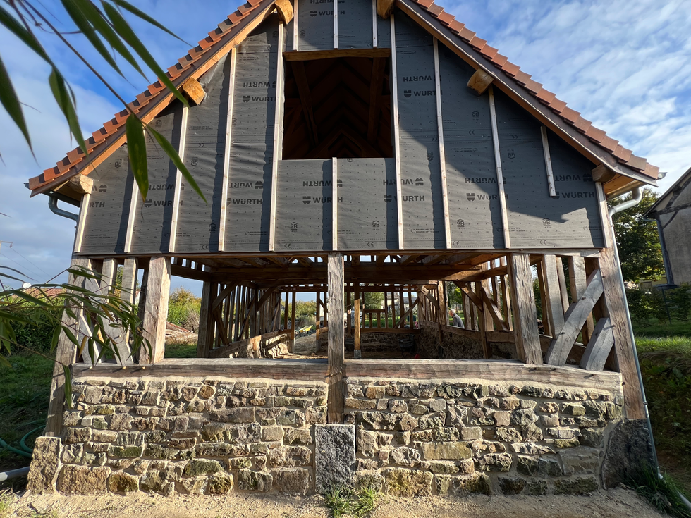 Le bâtiment, sorti de terre cet été, est le résultat d’un travail artisanal soigné. Chaque élément de la charpente a été taillé à la hache, offrant une structure à la fois traditionnelle et robuste, sur laquelle viendra s’appuyer la maçonnerie de soubassement en pierre.